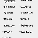This list is certainly not an inclusive list of seventies fonts but rather a few of my favourite fonts from the era. 1. American Typewriter 2. Avant Garde Gothic 3. Bookman 4. Busorama 5. Candice 6. Caslon 224 7. Cooper 8. Grouch 9. Lazybones 10. Octopuss 11. Ronda 12. Serif Gothic 13. Tango